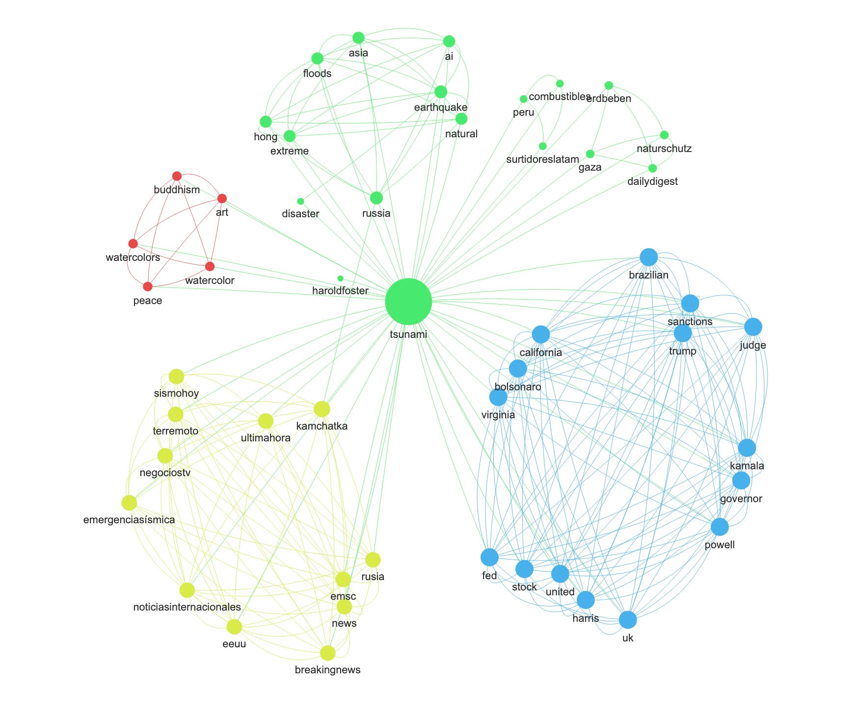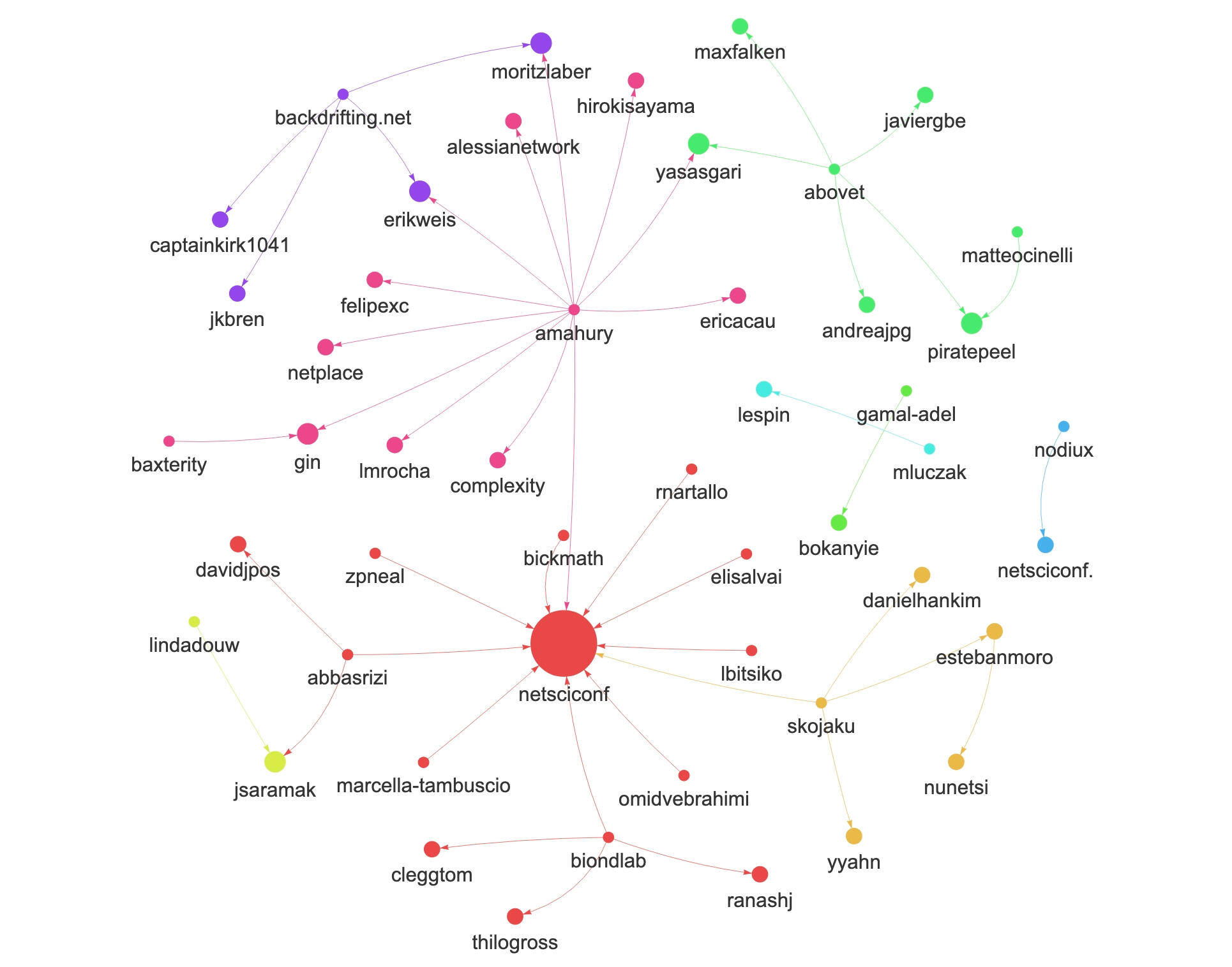 Different colors are used to indicate distinct sub-communities within the graph.This network helps identify influencers, conversation hubs, and bridges within the discourse.